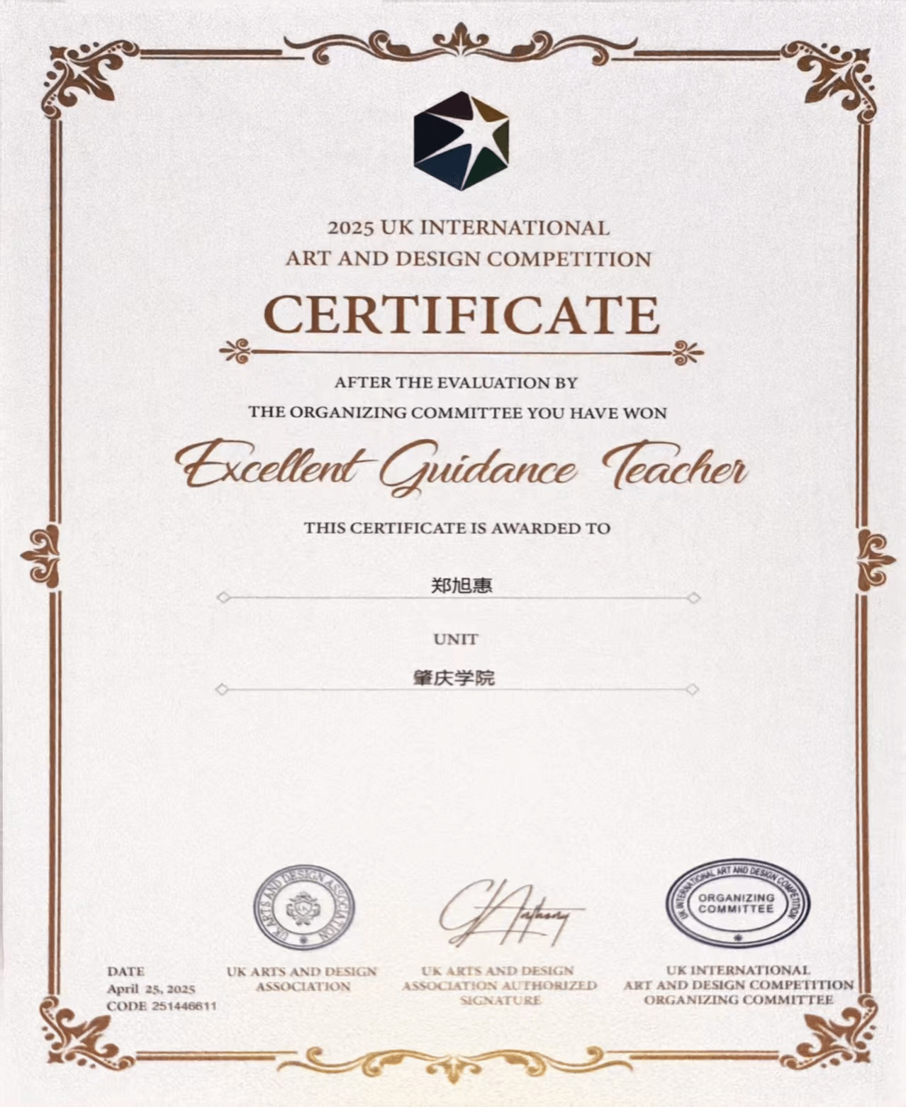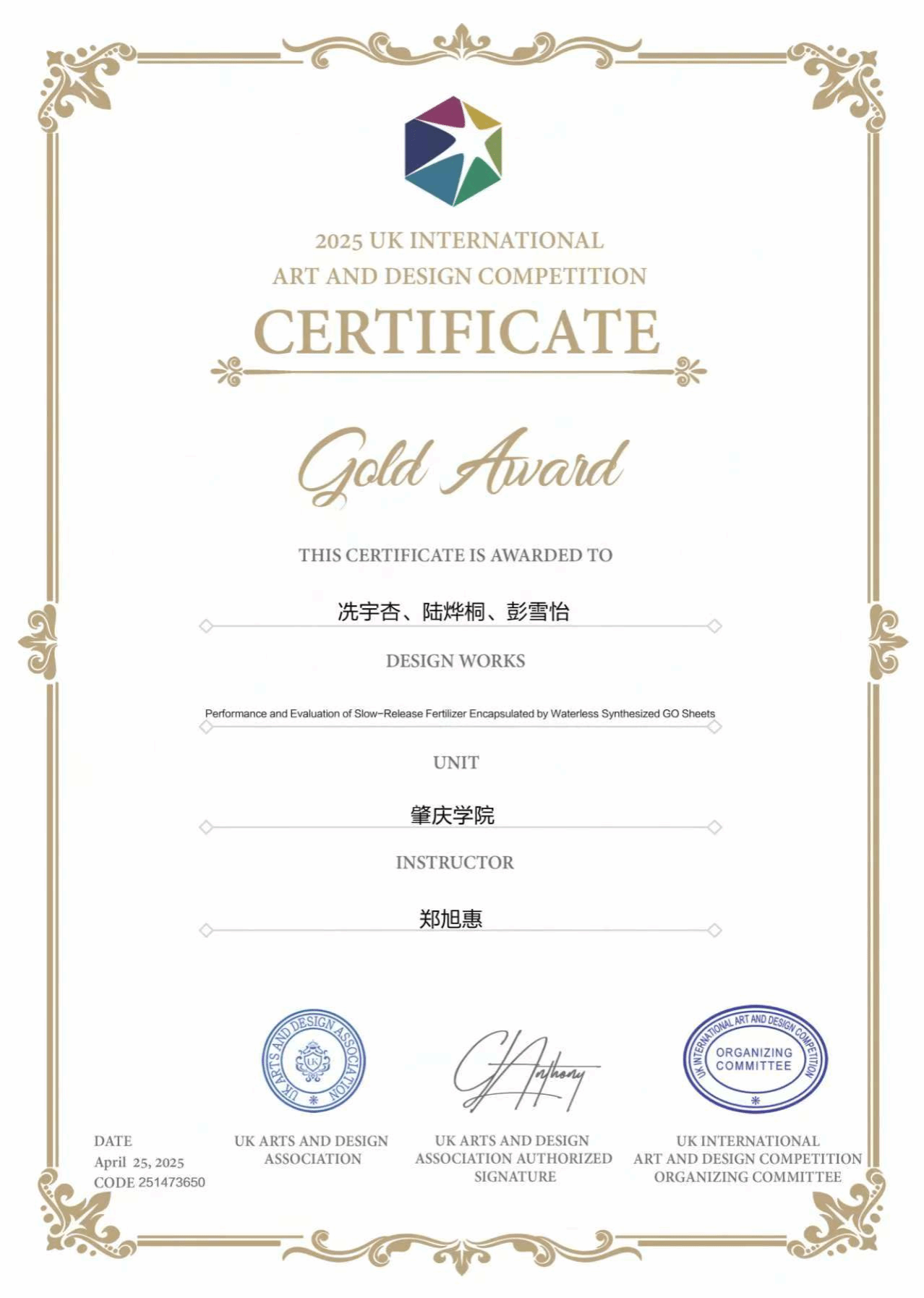近日,由英国艺术设计协会(UK-AADA)主办的2025英国国际艺术设计大赛全球评审结果正式揭晓。太阳成tyc122cc郑旭惠老师指导的参赛作品,赢得国际评审委员会高度赞誉,最终斩获:金奖、铜奖、优秀奖各1项,郑旭惠获评优秀指导教师。