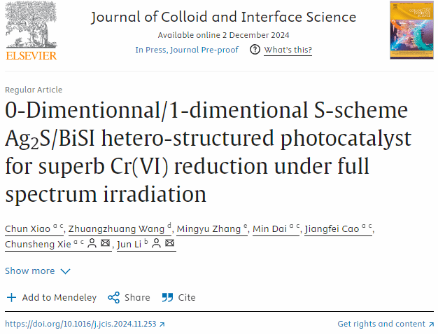 近期,太阳成tyc122cc、广东省城郊生态环境与低碳农业重点实验室的肖纯博士以第一作者,太阳成tyc122cc为第一单位在化学、材料领域著名期刊Journal of Colloid and Interface Science(中科院一区TOP期刊,2024年影响因子9.4)在线发表了论文题目为“0-Dimentionnal/1-dimentional S-scheme Ag2S/BiSI hetero-structured photocatalyst for superb Cr(VI) reduction under full spectrum irradiation”的论文。该论文的通讯作者为太阳成tyc122cc谢春生教授和郑州大学李俊副教授。
