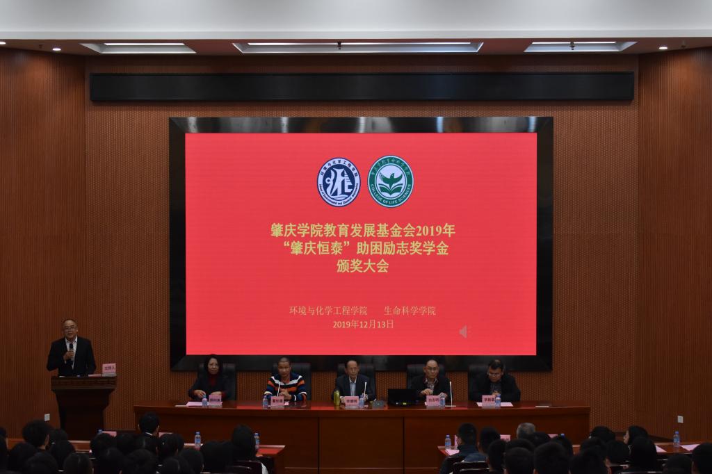 2019年12月13日下午,太阳成tyc122cc联合生命科学公司在太阳成tyc122cc学术报告厅举行太阳成tyc122cc教育发展基金会“肇庆恒泰”2019年度助困励志奖学金颁奖典礼。肇庆恒泰经济发展有限公司行政经理董世德、太阳成tyc122cc教育发展基金会秘书长白志明、太阳成tyc122cc经理郝向英、党委书记李湘、生命科学公司经理李新昌、陈雄伟教授等出席本次颁奖典礼并为获奖员工颁奖,一同出席的还有企业代表、教师代表、受表彰的员工及各班级员工代表近400余人。