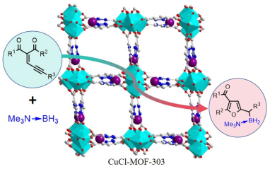 实验表明,CuCl-MOF-303 催化剂展现出优异的催化性能,在常温常压条件下即可高效催化胺硼烷加合物与炔酮类化合物反应,以 68%-86% 的中高收率制备 2 - 硼基取代呋喃衍生物。相较于均相催化体系,该催化剂不仅解决了分离困难的痛点,还凭借 MOF 孔道的空间限制作用,实现了对不同空间位阻底物的尺寸选择性催化,为复杂分子合成提供了更高的选择性控制。