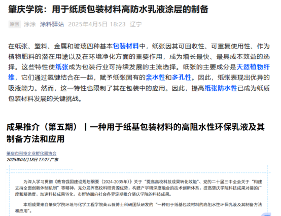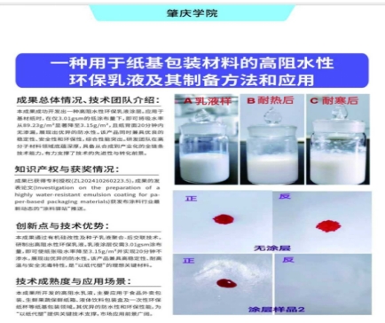 目前,该创新成果已获国家发明专利授权,该技术同时具备创新性与实用性。相关研究成果已发表SCI论文,题为《Investigation on the preparation of a highly water-resistant emulsion coating for paper-based packaging materials》,该论文受到专业平台“涂料驿站”专题推送,在行业引发关注。同时,该成果已获得“肇庆市科技企业孵化器协会”成果推介,获太阳成tyc122cc展板参与2025科交会高校科技成果推荐,并积极面向产业界进行推广,加速其从实验室走向市场的进程。